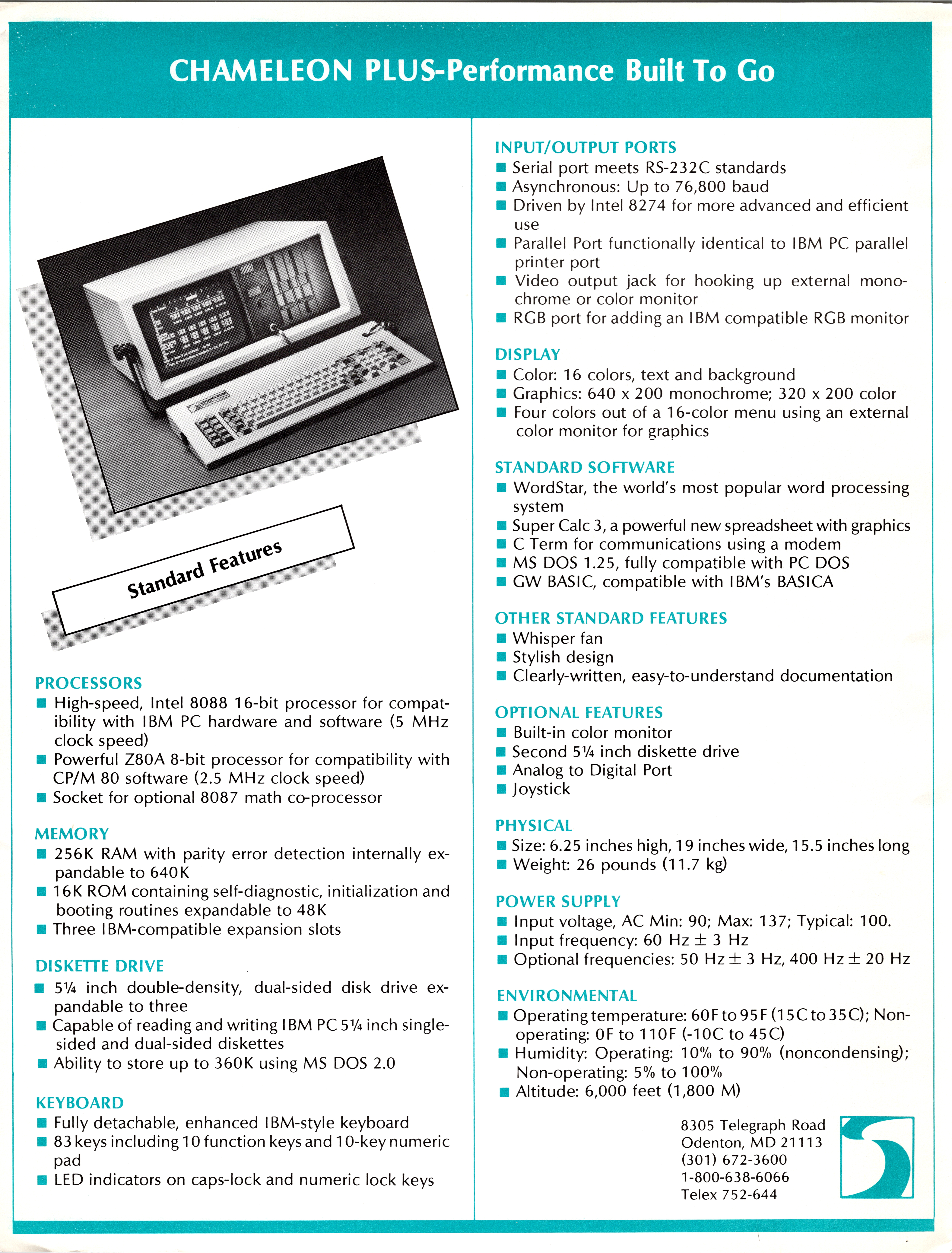 Specifications of the Chameleon Plus from a Seequa advertising brochure. |